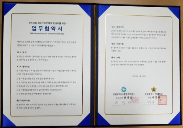[한국연예축제일보, 황해식기자] 인천광역시 계양구보건소는 인천인혜학교와 지난 15일 취약계층 장애 아동·청소년 비만예방, 관리사업을 위한 업무협약을 체결했다.