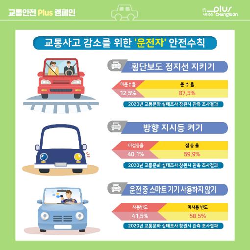 [한국연예축제일보, 유혜경기자] 창원시는 올해 플러스 성장 원년을 맞이해 교통안전문화 확산을 통한 시민 일상의 플러스 성장을 실현하고자 교통사고 원인분석으로 개선이 필요한 내용을 매월 주제로 선정해 ‘교통안전 Plus 캠페인’을 전개하고 있다고 16일 밝혔다.