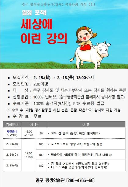 중구 관계자는 “평생학습관이 개관한 2016년부터 이어져 온 강좌지만 지난해 코로나19로 진행하지 못해 올해는 비대면으로 특강을 준비했다”며 “코로나19로 인해 교육트렌드가 혁신적으로 변화하는 시점이기에 꼭 필요한 강의라 생각돼 비대면으로라도 준비한 만큼, 프리랜서인 강사들이 큰꿈 작은학교나 재능기부 마켓 등 다양한 강사활동을 할 수 있도록 많이 참여했으면 한다”고 밝혔다.