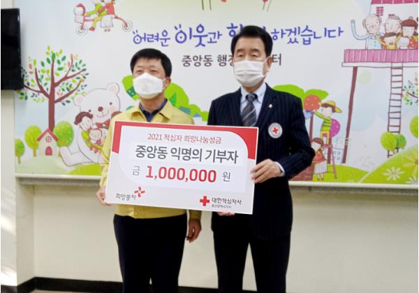 중앙동 행정복지센터는 이번에 적십자 특별회비를 전달한 이 익명의 기부자가 중앙동 주민으로, 평소에서 이웃사랑 나눔을 지속적으로 실천해 온 것으로 파악했다.