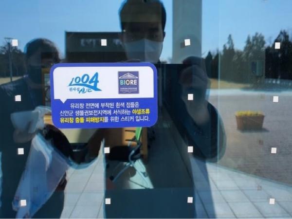 신안군청사에서도 최근 1년 동안 되지빠귀, 방울새 등 60여마리의 야생조류가 피해를 입는 것으로 조사되었다. 이에따라 야생조류 피해 방지를 위해 청사 본관, 보건소, 의회, 별관 등 4개동 1,500㎡ 면적의 유리창에 충돌방지 스티커를 부착하였다.
