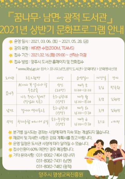 [한국연예축제일보, 유혜경기자] 양주시는 오는 3월 6일부터 꿈나무?남면?광적 등 3개 도서관에서 상반기 온라인 비대면 문화프로그램을 운영한다.