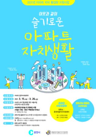 (재)춘천시마을자치지원센터는 아파트의 자치 활성화와 건강한 주거공동체 문화 조성을 위해 ‘2021년 아파트 자치 활성화 지원사업’을 추진한다고 밝혔다.