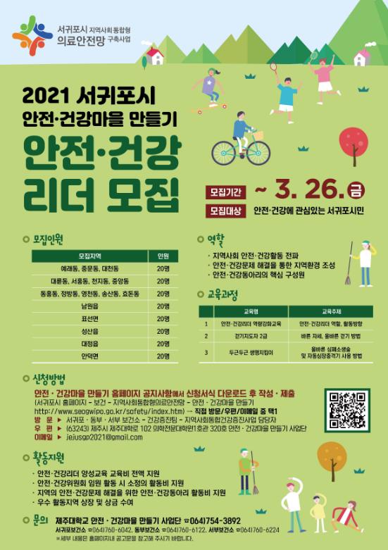 안전·건강 리더는 2021년 안전·건강마을 만들기 사업의 핵심 역할 수행자로서 서귀포시 지역사회의 안전·건강문제 해결을 통한 지역환경 조성과 안전·건강활동을 널리 전파하는 역할을 수행할 예정이다.