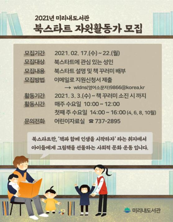 선정되면 2월 24일 김지연 그림책 작가와 함께하는 비대면 교육을 거쳐 3월 3일부터 미리내도서관 어린이자료실에서 북스타트 설명 및 책 꾸러미 배부 활동을 펼치게 된다.