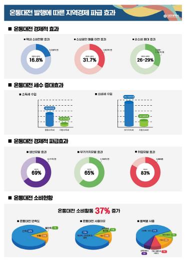 온통대전의 지역경제 파급효과를 보면 온통대전 발행으로 인한 세수 증대 효과는 종합소득세 42억원, 지방소득세 4억 2천만원이 증가한 것으로 나타났다.