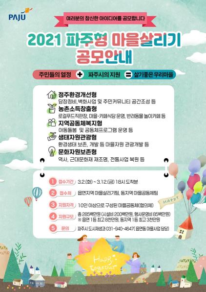 [한국연예축제일보, 유혜경기자] 파주시는 오는 3월부터 파주형 마을살리기 공모사업 신청을 시작한다.