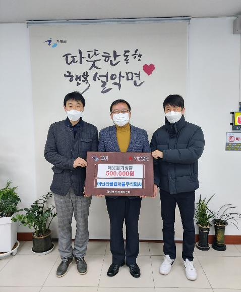 [한국연예축제일보, 유혜경기자] 가평군 설악면 아난티클럽서울주식회사(대표 이만규)는 지난 2월 10일 설악면행정복지센터를 방문하여 설 명절을 맞아 관내 어려운 이웃에게 전달해 달라며 성금 50만원을 전달했다.