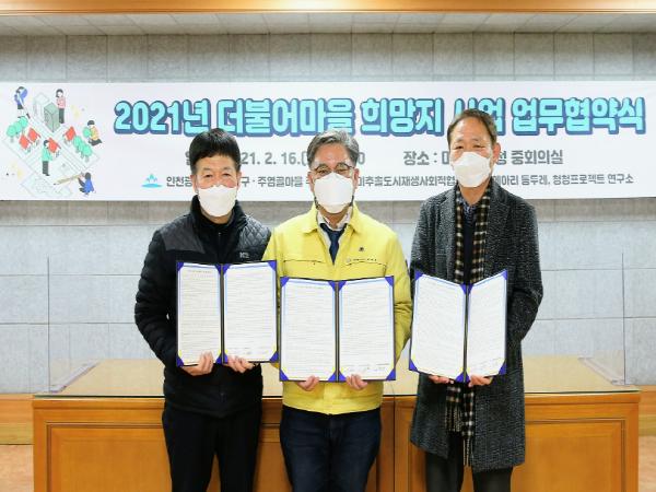 업무 협약식에는 김정식 미추홀구청장을 비롯해 더불어마을 희망지사업 대상지로 선정된 마을공동체 2곳과 지원 단체 2곳의 대표 등이 참석했다.