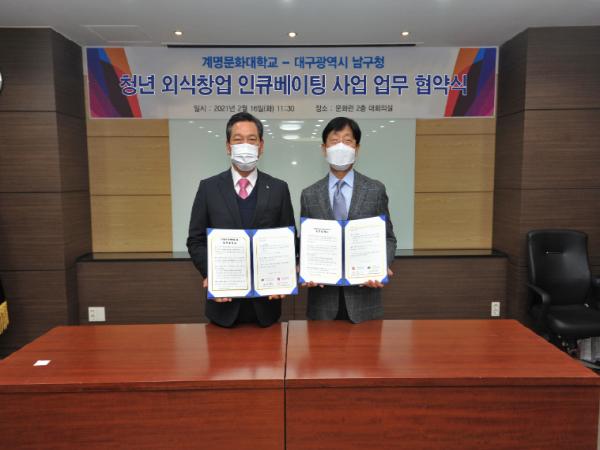 [한국연예축제일보, 안성경기자] 대구광역시 남구청과 계명문화대학교 두 기관은 지난 16일, 계명문화대학교 문화관 대회의실에서 남구 지역 청년들에게 외식창업 기회 제공을 위해 ‘청년 외식창업 인큐베이팅 업무협약’을 체결했다.