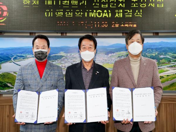 [한국연예축제일보, 안성경기자] 합천군은 지난 17일 군청 소회의실에서 넥스타테크놀로지(주) 김정덕 회장과 대통도시개발(주) 최우열 회장 등이 참석한 가운데 ‘합천 메디컬밸리 산업단지 조성’을 위한 이행협약(MOA) 체결을 했다.
