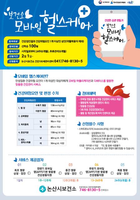 신청자격은 스마트폰 사용이 가능한 만19세 이상 논산시 거주자(논산시 직장인 포함)로. 혈압, 공복혈당, 허리둘레, 중성지방, 콜레스테롤(HDL)등 5가지 건강위험요인 중 1개 이상을 보유한 비질환자이며, 약물 복용자는 제외된다.