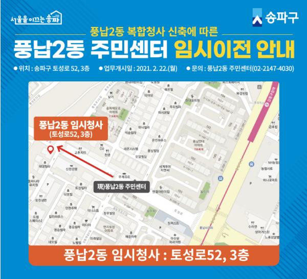 [한국연예축제일보, 유혜경기자] 송파구는 풍납2동 주민센터(토성로64) 신축청사 건립을 앞두고, 주민불편을 최소화할 수 있도록 2월 22일부터 임시청사를 운영한다.