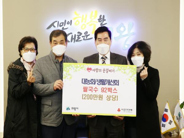 [한국연예축제일보, 유혜경기자] 의왕시 대농회(회장 김상석)와 생활개선회(회장 한은주)에서 16일 200만원 상당의 후원물품(쌀국수)을 의왕시에 전달했다.