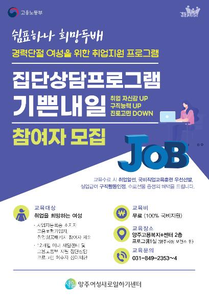 [한국연예축제일보, 유혜경기자] 양주여성새로일하기센터는 경력단절 여성을 대상으로 ‘집단상담프로그램’ 참여자를 연중 모집한다고 밝혔다.