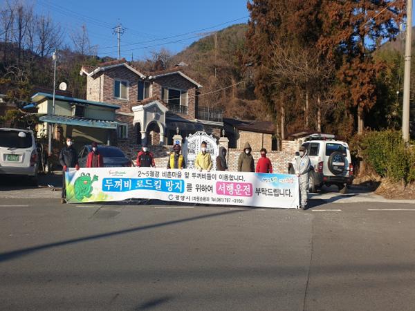 [한국연예축제일보, 유혜경기자] 광양시는 산란철을 맞은 두꺼비의 서식환경 보호를 위해 지난 15일 비평저수지에 두꺼비 이동 유도울타리(200m)를 설치하고, 서식지와 산란지 사이 도로 로드킬(찻길사고) 방지를 위한 홍보활동을 실시했다고 밝혔다.