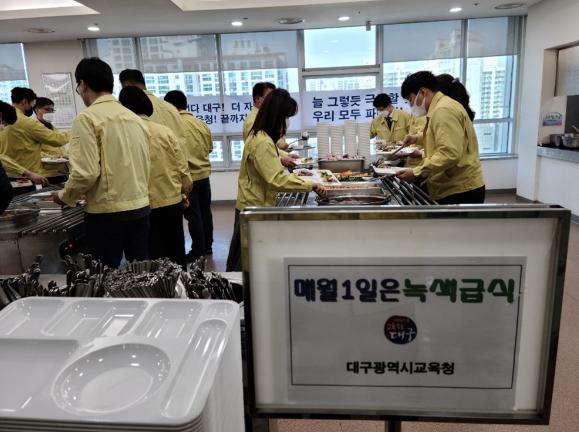 [한국연예축제일보, 서병진기자] 대구광역시교육청은 SDGs(Sustainable Development Goals; 지속 가능한 발전목표)의 실천의식 확산을 위하여 2021년 3월부터 매월 1일 녹색급식을 운영한다. 이는 교육청 내 구내식당에서 한 달에 한 번은 채식으로 전 메뉴를 구성하여 제공되는 것이다. 이는 대구시교육청에서 발표된「2021 환경교육(ESD) 추진계획」의 학교 환경교육 활성화 전략에 따라 솔선하여 환경의 중요성에 대한 인식 개선과 실천의지를 강화하자는 취지에서 시작되었다.