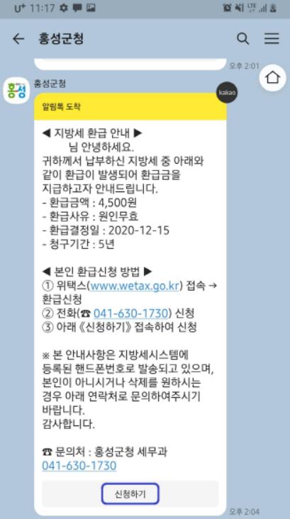 특히 군은 전국 지자체 최초로 찾아가는 환급서비스를 제공한다. 주민이 직접 세톡서비스를 신청해야 하는 타 지자체와 달리 홍성군은 환급 대상자를 직접 찾아 카카오톡을 통해 환급안내문을 전달하고 본인 인증과 계좌기입 등의 간단한 과정을 통해 신속하고 편리하게 환급을 받을 수 있도록 구축했다.