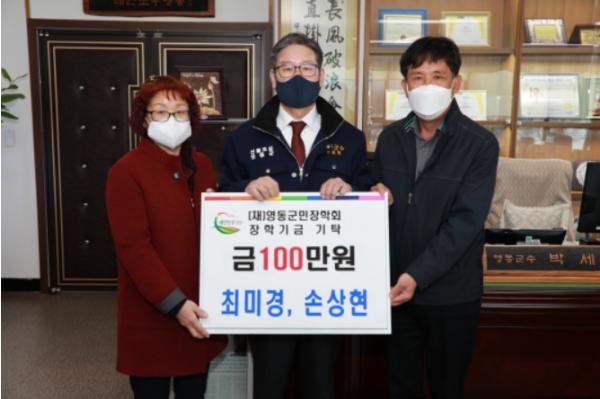 지난 17일 한국생활개선영동군연합회 최미경 회장 내외가 영동군청을 찾아 개인적으로 100만원을 기탁하며 지역인재 양성에 힘을 보탰다.