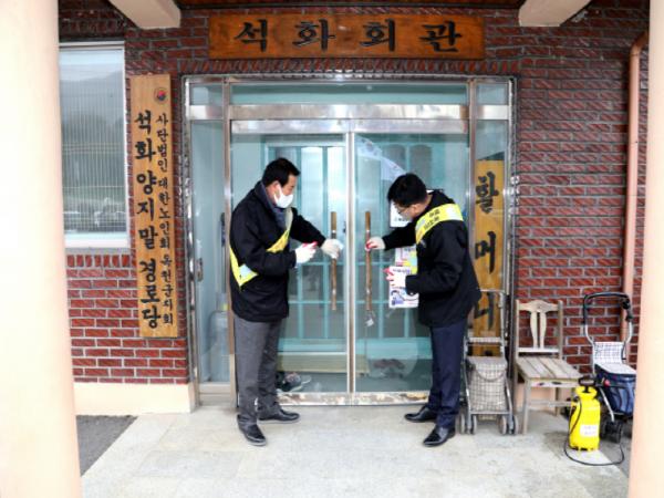 16일 사전준비 방역을 위해 김재종 옥천군수는 동이면 석화 양지말 경로당을 방문하여 직접 방역에 참여하였다.