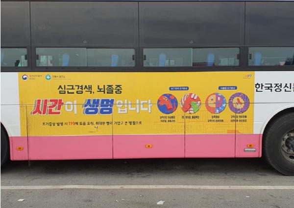 안동시 시내버스의 외부(양측면) 광고판에 뇌졸중, 심근경색증의 조기 증상 및 대처방법에 대한 핵심 문구를 홍보하며 지역주민의 인식 개선에 나섰다.