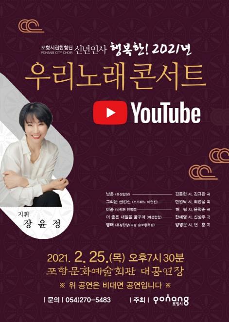 이번 공연은 남촌, 그리운 금강산, 마중, 더 좋은 내일을 꿈꾸며, 명태 등 총5곡을 혼성합창, 솔로, 여성합창으로 선보이며 ‘우리노래 콘서트’라는 부재로 진행된다. 선 촬영 후 25일 오후 7시 30분에 포항시 공식 유튜브 채널에서 공개 될 예정이다.