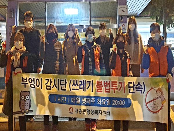 [한국연예축제일보, 유혜경기자] 울산 동구 대송동 행정복지센터는 대송동 통장회(회장 정정선)와 함께 지난 2월 16일 오후 8시 대송농수산물시장 및 대송공원 일대에서 부엉이 감시단 활동을 펼쳤다.