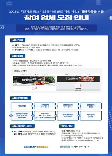 [한국연예축제일보, 안성경기자] 경기도와 경기도주식회사가 올해 온라인 유통몰, SNS 기반 공동구매 채널 등 온라인 판로지원을 희망하는 경기도내 중소기업을 찾는다.
