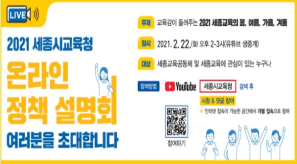 [한국연예축제일보, 서병진기자] 세종특별자치시교육청은 오는 22일 오후 2시 ‘2021 온라인 세종교육 설명회’를 개최한다.