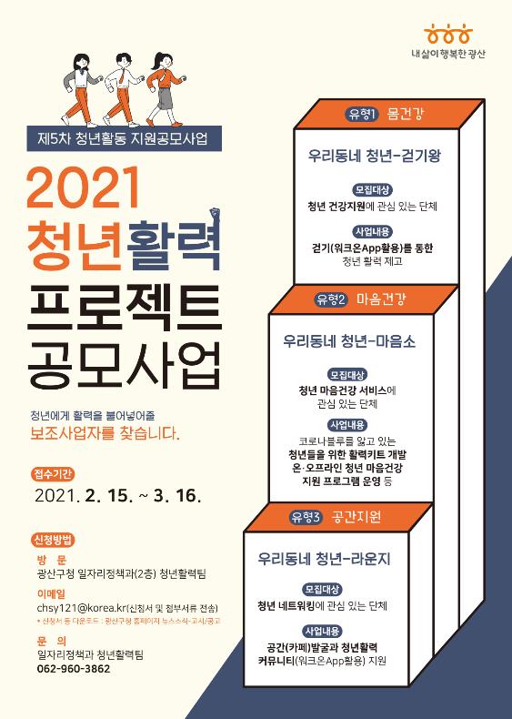 [한국연예축제일보, 유혜경기자] 광주광역시 광산구가, 활력 넘치고 행복한 삶의 주체로 청년이 거듭날 수 있도록 지원하는, ‘2021 청년활력프로젝트 공모사업’ 참여 청년단체를 다음달 16일까지 모집한다.