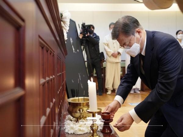 대통령은 묵념 후 영전에 국화와 술잔을 올린 뒤 절을 하고, 유족들을 위로했다.