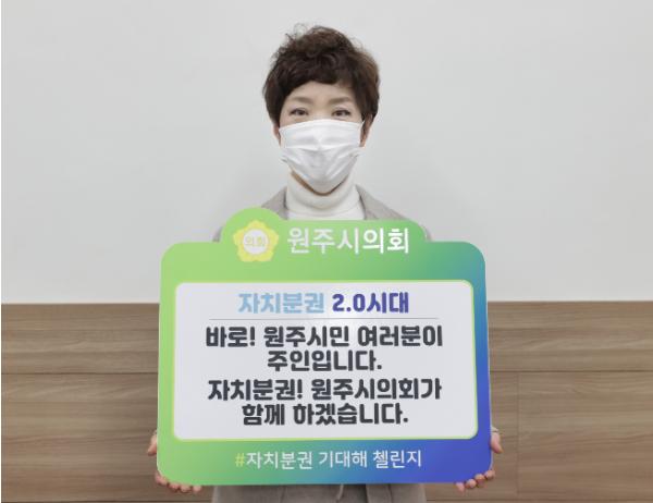 [한국연예축제일보, 허난세기자] 원주시의회 이용철 의원과 최미옥 의원은 18일 ‘자치분권 기대해’ 챌린지 캠페인에 동참했다.