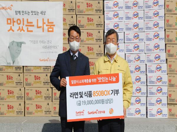 [한국연예축제일보, 유혜경기자] 밀양시는 삼양식품과 삼양원동문화재단에서 18일 관내 소외계층에 전달해 달라며 삼양라면, 큰컵불타는 고추짜장, 유제품 등 6종 총850박스(1,900만원 상당)를 밀양시에 기탁했다고 밝혔다.