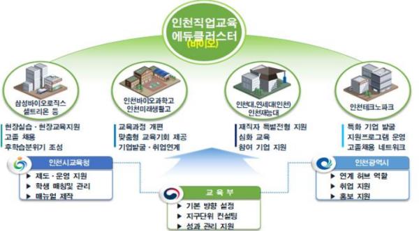 바이오 에듀클러스터는 인천광역시 일자리경제본부 미래산업과의 바이오인력양성사업(K-NIBRT)과 연계하여 ‘직업계고 학생 선발 → 바이오공정 학점 이수 → 취업확정 → 조기취업형 계약학과 → 지역사회의 바이오 인재 정착’ 로드맵을 통해 성장을 지원한다.