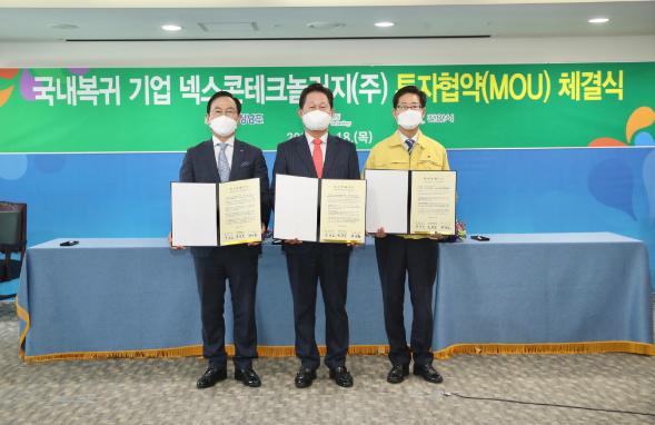 시는 18일 충남도청 상황실에서 천안시 국내복귀기업 첫 번째 주자인 넥스콘테크놀러지와 투자협약(MOU)을 체결했다고 밝혔다.