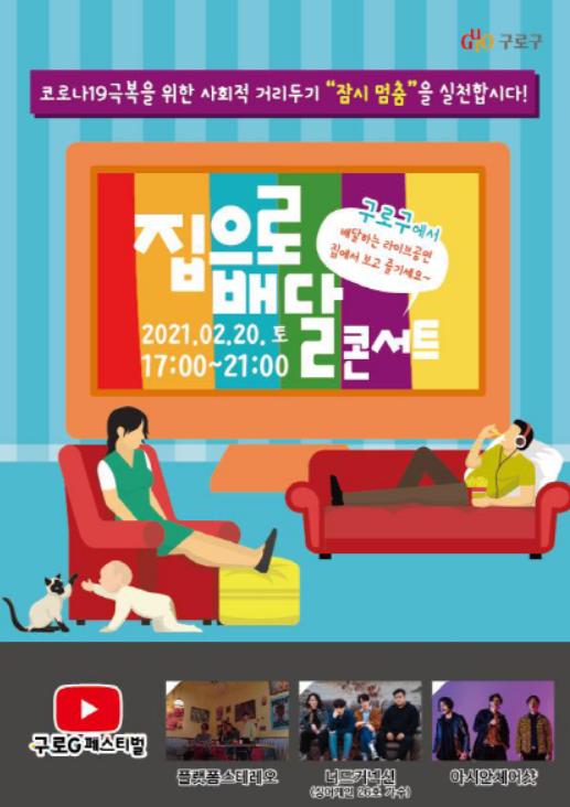 이번 ‘집으로 배달’ 온라인 콘서트는 20일 오후 5시부터 3부에 걸쳐 진행되며 구로G페스티벌 유튜브 채널을 통해 실시간 송출된다.