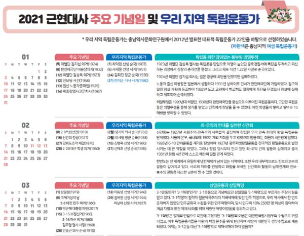[한국연예축제일보, 서병진기자] 충남교육청은 근현대사 주요 기념일 및 우리 지역 독립운동가의 순국일이 기록된 역사 달력을 제작하여 학교 현장에 배포했다.
