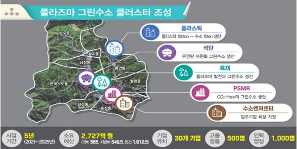 강원도는 ’25년까지 총 2,727억원(국 577억, 지방 540억, 민간 1,610억)을 투입하여 태백시 일원에 플라즈마 그린수소 클러스터를 조성할 예정이며, 기업유치 30개, 신규 일자리 500개, 수소분야 전문인력 1,000명 양성 등 지역경제 활성화에도 가시적인 효과를 가져 올 것으로 기대한다.