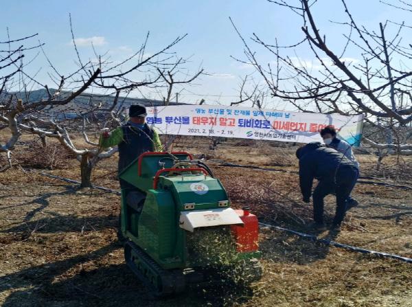 영농 잔재물을 불법으로 태우지 않고 잔가지 파쇄기로 파쇄하여 퇴비화 하도록 마을단위 파쇄작업을 농기계 임대사업소에서 이틀간 지원·운영했다.