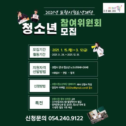 [한국연예축제일보, 유혜경기자] 포항시청소년재단에서 포항시청소년참여위원회 위원을 오는 3월 12일까지 모집한다.