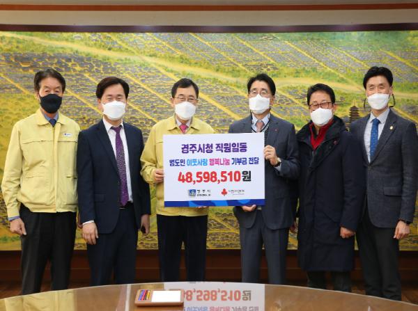 [한국연예축제일보, 유혜경기자] 경주시에서는 18일 시청 대외협력실에서 ‘범도민 이웃사랑 행복나눔 캠페인’을 실시하여 모은 4,859만8,510원의 기부금을 경북사회복지공동모금회(회장 전우헌)에 전달했다.