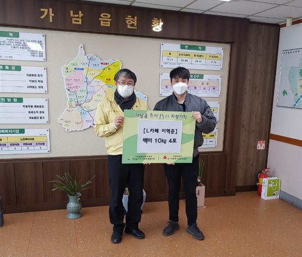 [한국연예축제일보, 유혜경기자] 지난 17일 가남읍 일신로에 위치한 L cafe는 어려운 이웃에게 전달해 달라며 20만원 상당의 백미 10kg 4포를 가남읍 행정복지센터(읍장 강대준)에 기탁했다.