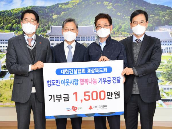 도내 668개 종합건설사업자를 회원사로 둔 대한건설협회 경상북도회는 지난해 코로나19 극복을 위해 써달라며 1억원을 경북사회복지공동모금회와 대한적십자경북지사에 각각 5천만원씩 기탁한 것을 시작으로 태풍(마이삭, 하이선) 피해 극복 성금 5천만원, 독립유공자 후손 주거개선 사업 후원금 1천만원, 사랑의 열매 성금 5천만원 등 지역사회가 어려움에 처할 때마다 발벗고 나섰다.