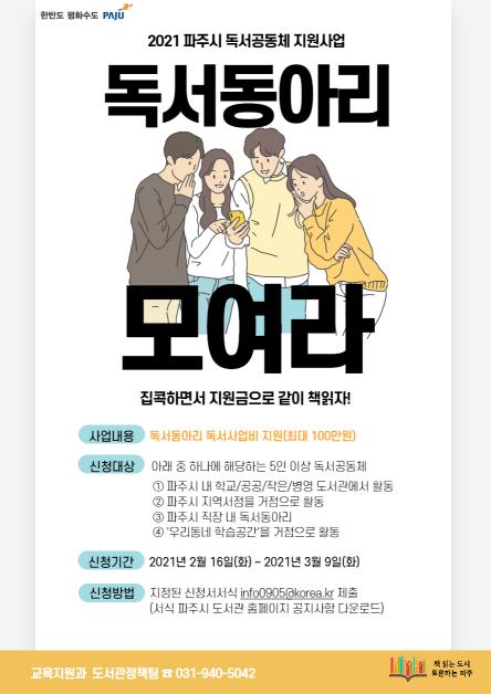 [한국연예축제일보, 유혜경기자] 파주시는 2월 16일부터 3월 9일까지 2021년 파주시 독서공동체 지원사업의 지원동아리를 모집한다.