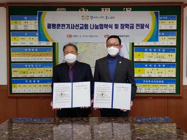 [한국연예축제일보, 유혜경기자] 광명시 철산2동행정복지센터(동장 박상현)는 17일 광명운전기사선교회와 나눔협약식을 갖고 복지사업에 대한 상호 협력과 지원을 약속했으며 첫 사업으로 신학기를 맞이하여 저소득 가정의 중?고등학생 및 대학생에게 총 100만원의 장학금을 전달했다.