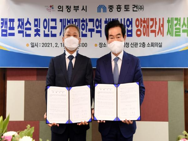 [한국연예축제일보, 유혜경기자] 의정부시는 2월 18일 중흥토건㈜(대표이사 이경호)과 캠프잭슨 및 인근지역의 개발제한구역 해제사업을 원만하게 추진하기 위해 양해각서(MOU)를 체결했다고 밝혔다.