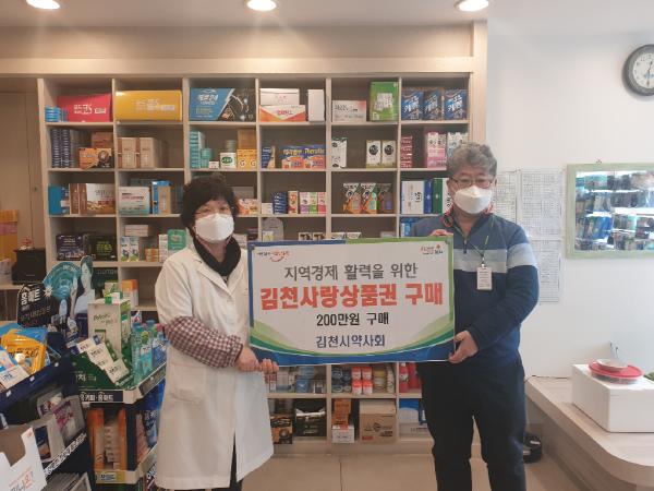 김천시 약사회에서는 코로나19로 어려운 경제위기 극복에 힘을 보태고자 김천사랑상품권 200만원을 구매하였고 그 중 100만원을 어려운 이웃들을 위해 써달라며 경북공동모금회에 기부하여 소상공인들과 불우이웃을 위한 아름다운 기부와 착한 소비문화 조성이라는 1석 2조의 역할을 했다.