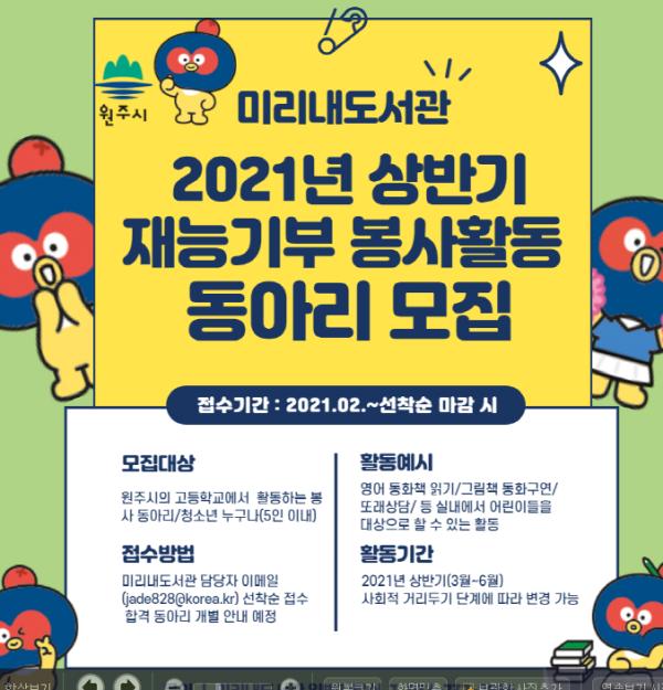 [한국연예축제일보, 유혜경기자] 오는 3월 개관을 앞두고 있는 원주 혁신도시 미리내도서관이 상반기(3~6월) 재능기부 봉사활동에 참여할 고등학교 동아리 학생을 모집한다.
