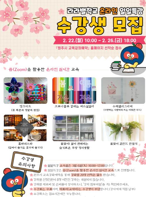 [한국연예축제일보, 이순례기자] 원주시 평생교육원 학습관은 코로나19로 지친 시민들의 일상에 활력을 불어넣기 위해 오는 3월 6일 라라밸학교 온라인 일일특강을 운영한다.