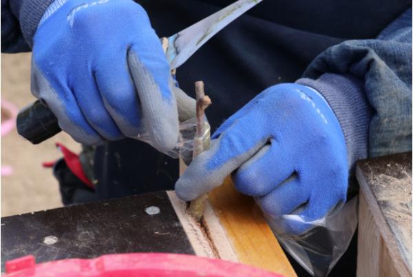 이날 작업을 통해 길이 7~10㎝ 정도로 붙여진 대목과 접수는 1년 후인 내년 나무 심는 철을 맞춰 최대 길이 150~200㎝까지 키인후 시중에 유통된다.